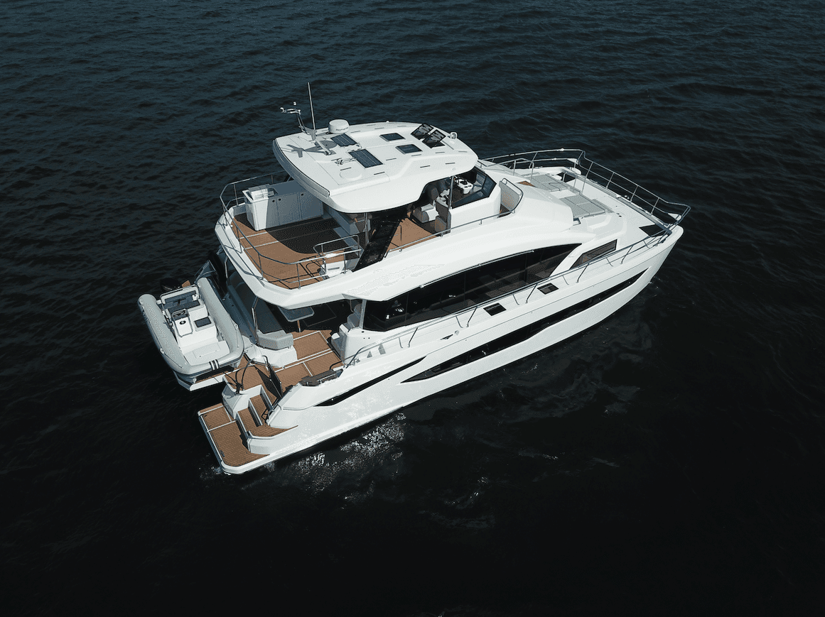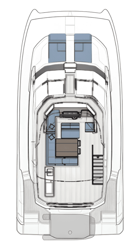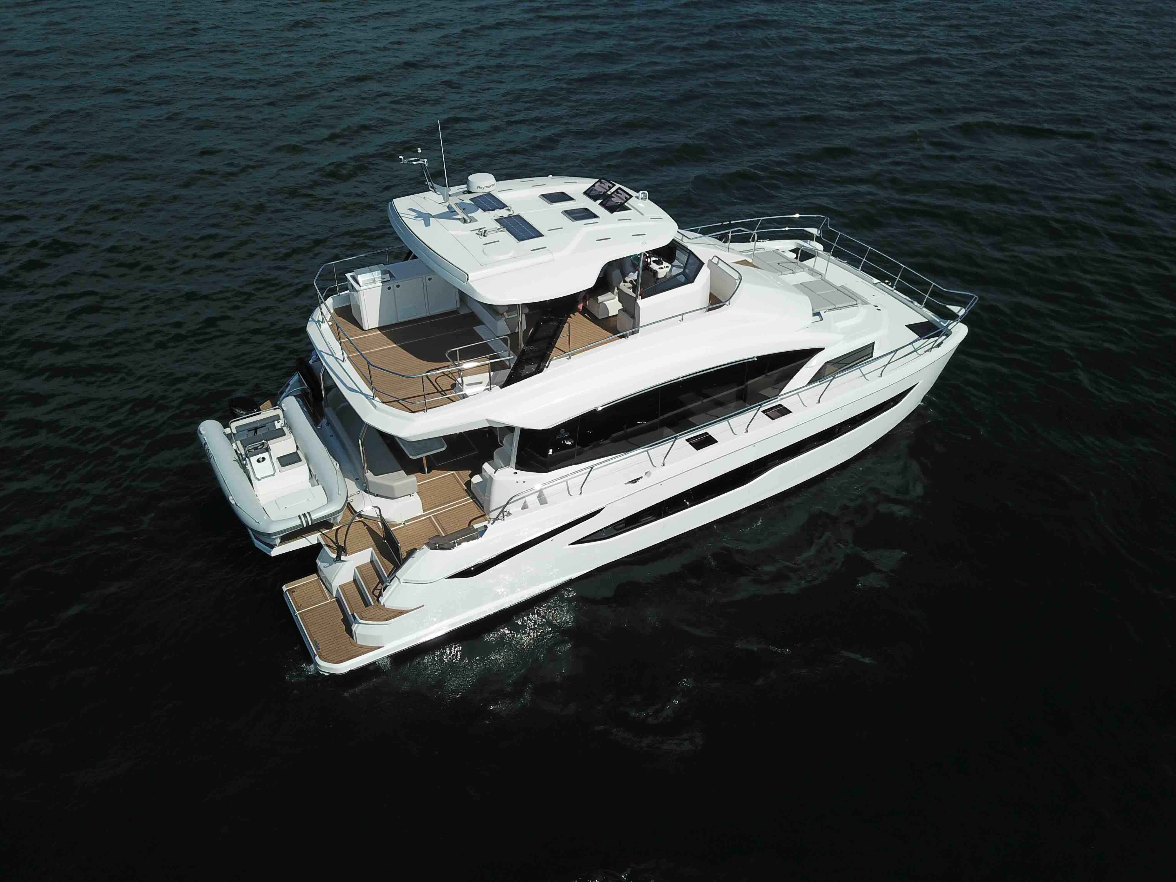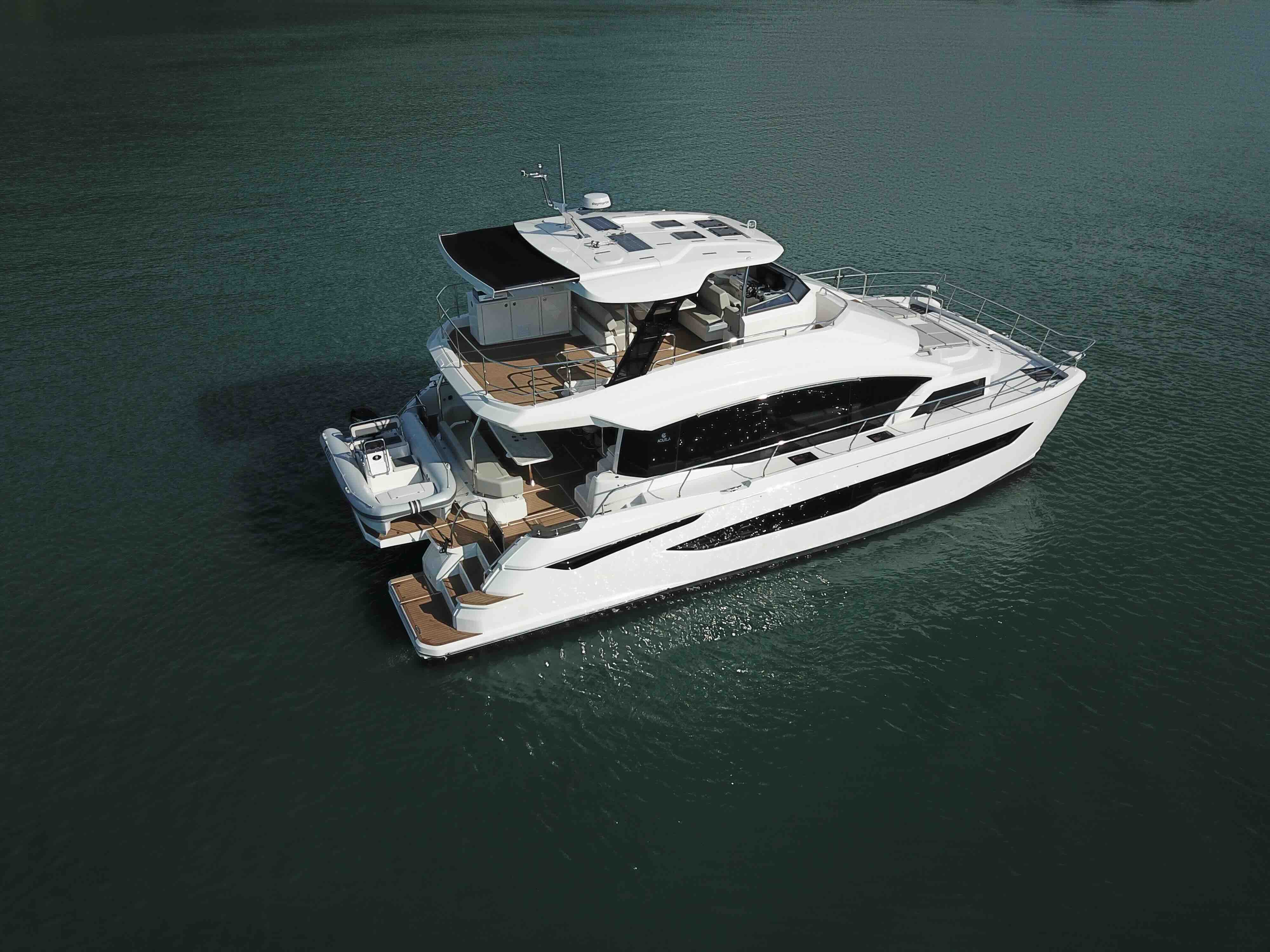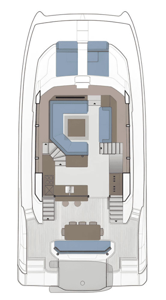 The Ultimate Entertainment Flybridge & Outdoor Living. Designed for the ultimate host, the massive flybridge features an electric retracting canvas and a full wet bar for sunset cocktails. Seamlessly move from the bridge to the bow via direct access, or launch the 14ft RIB tender using the hydraulic aft platform. Finished in synthetic teak with striking underwater LED lighting, the Aquila 54 turns heads in every marina while offering effortless, dual-thruster maneuvering.