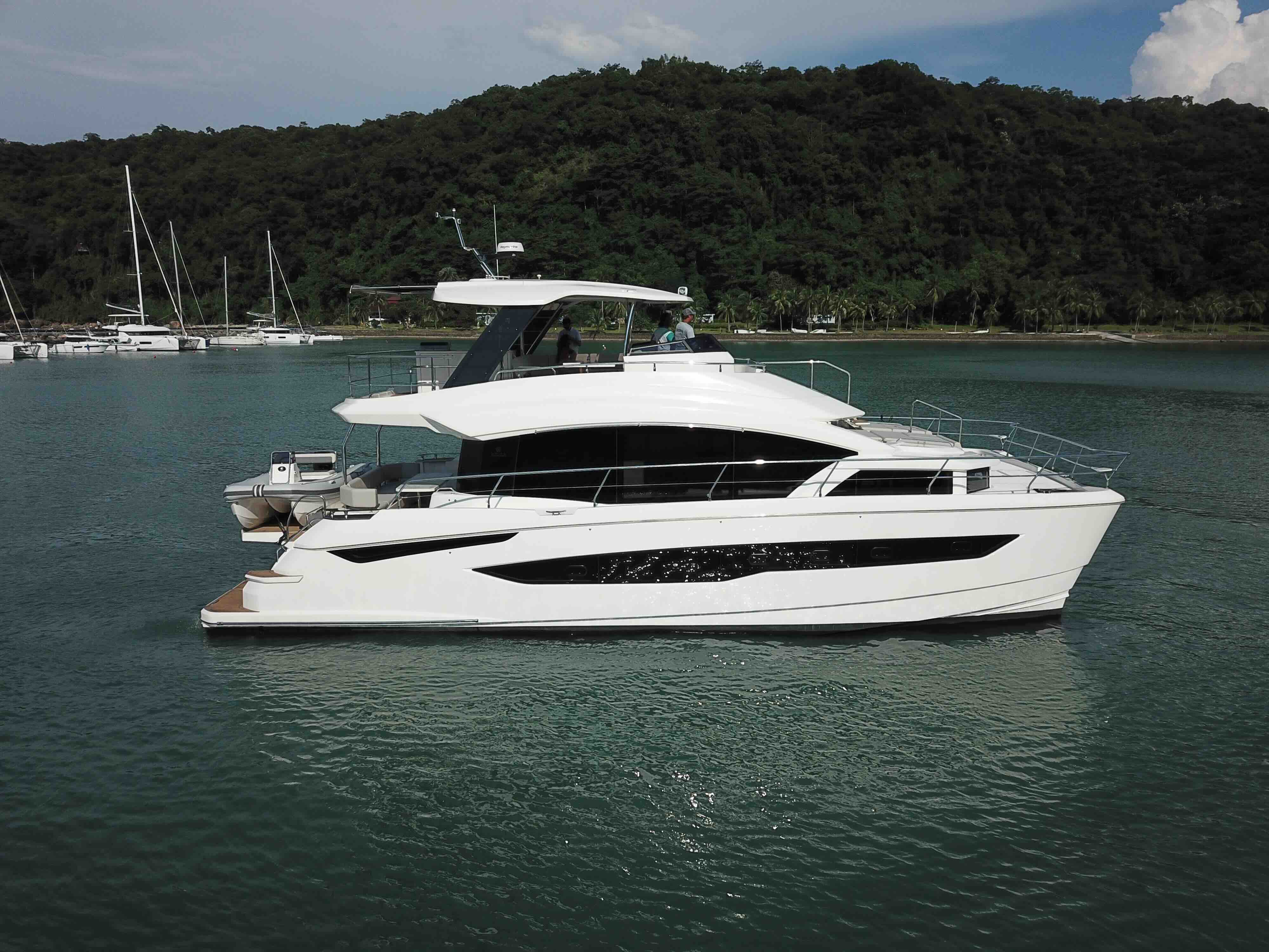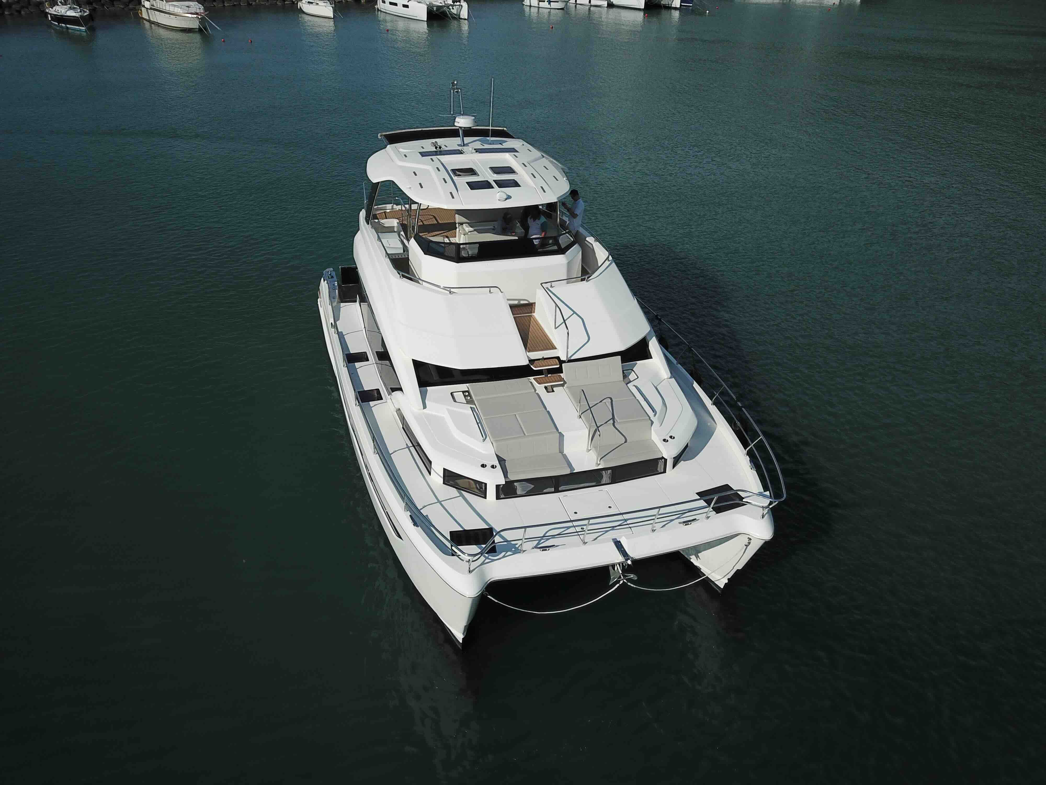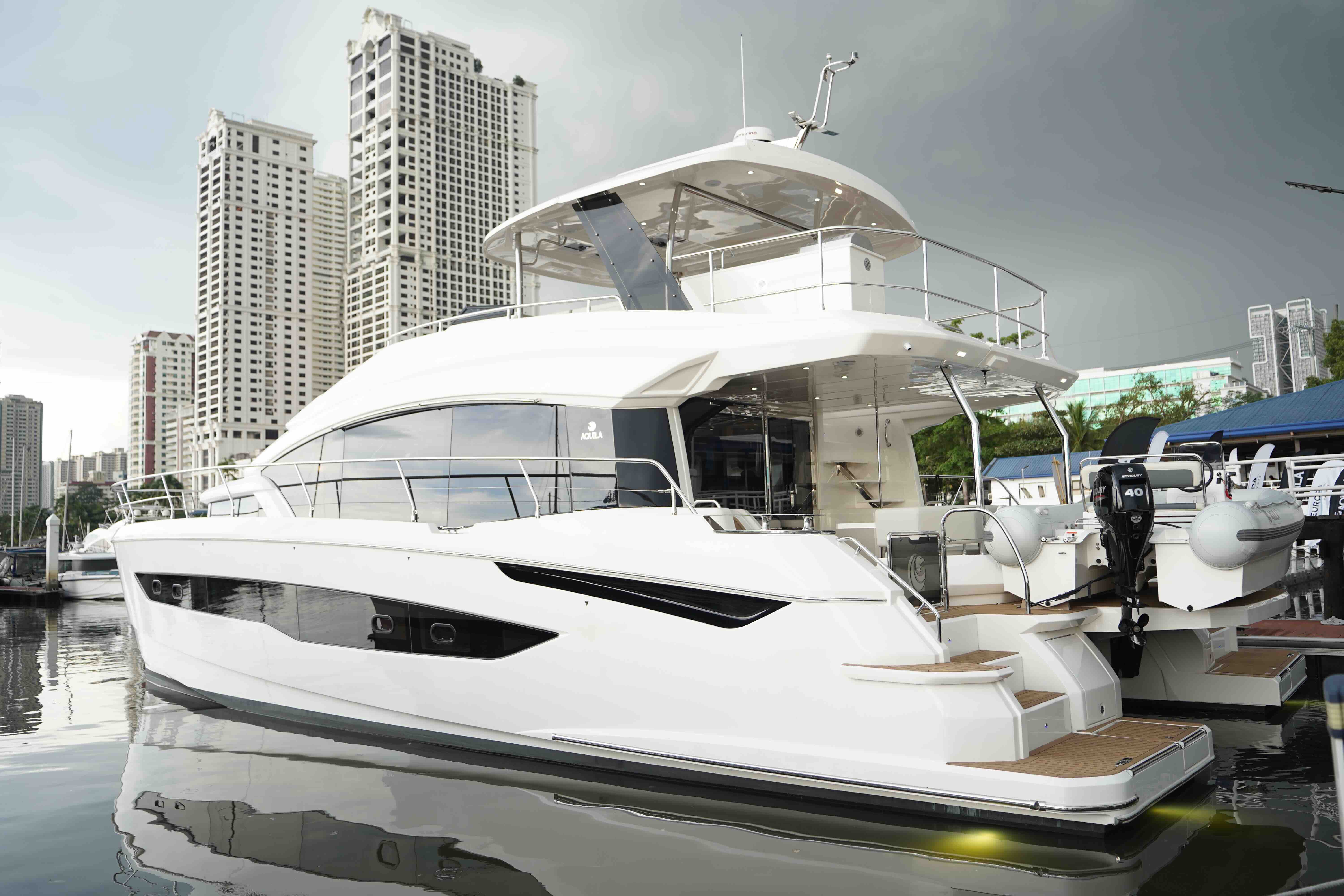 The Ultimate Entertainment Flybridge & Outdoor Living. Designed for the ultimate host, the massive flybridge features an electric retracting canvas and a full wet bar for sunset cocktails. Seamlessly move from the bridge to the bow via direct access, or launch the 14ft RIB tender using the hydraulic aft platform. Finished in synthetic teak with striking underwater LED lighting, the Aquila 54 turns heads in every marina while offering effortless, dual-thruster maneuvering.