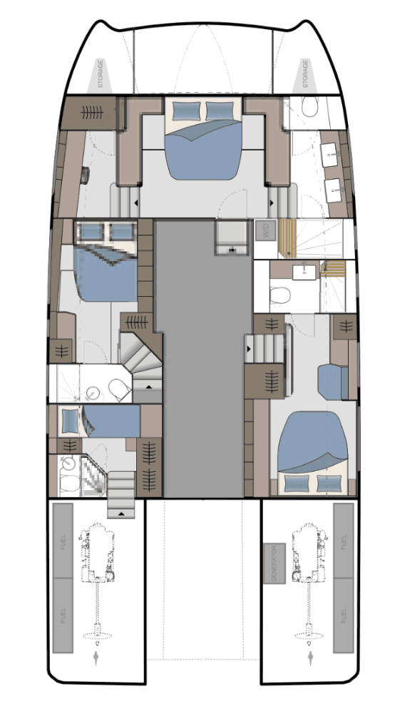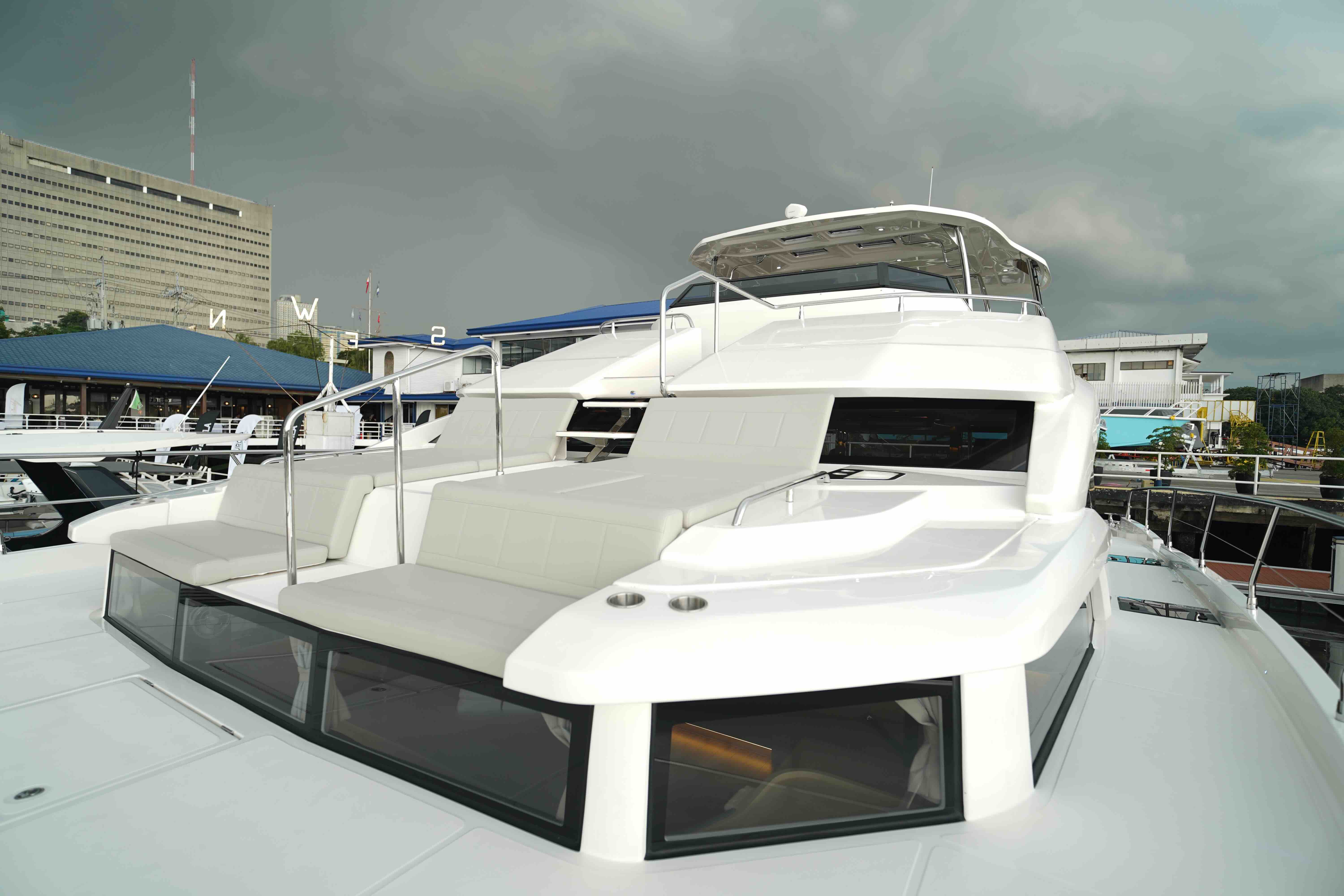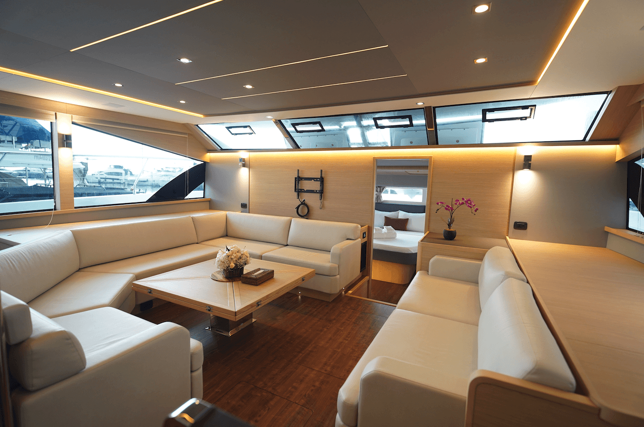 Expansive Full-Beam Luxury & Home-Like Comfort. Luxury meets functionality in a four-cabin layout headlined by a stunning full-beam master suite. The light-drenched salon offers 360-degree views and a "home-style" galley equipped with a 23-bottle wine cellar and induction stove. Whether hosting a formal dinner at the high/low table or enjoying the indoor-outdoor flow of the integrated cockpit bar, the 77,000 BTU climate control and Fusion audio ensure total comfort in any weather.