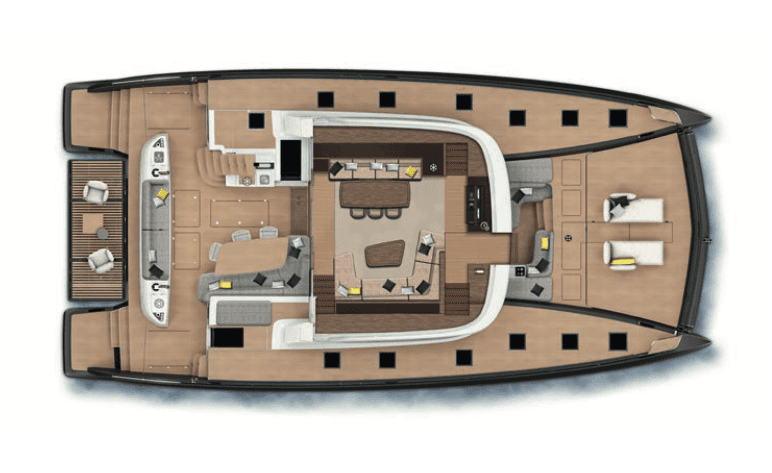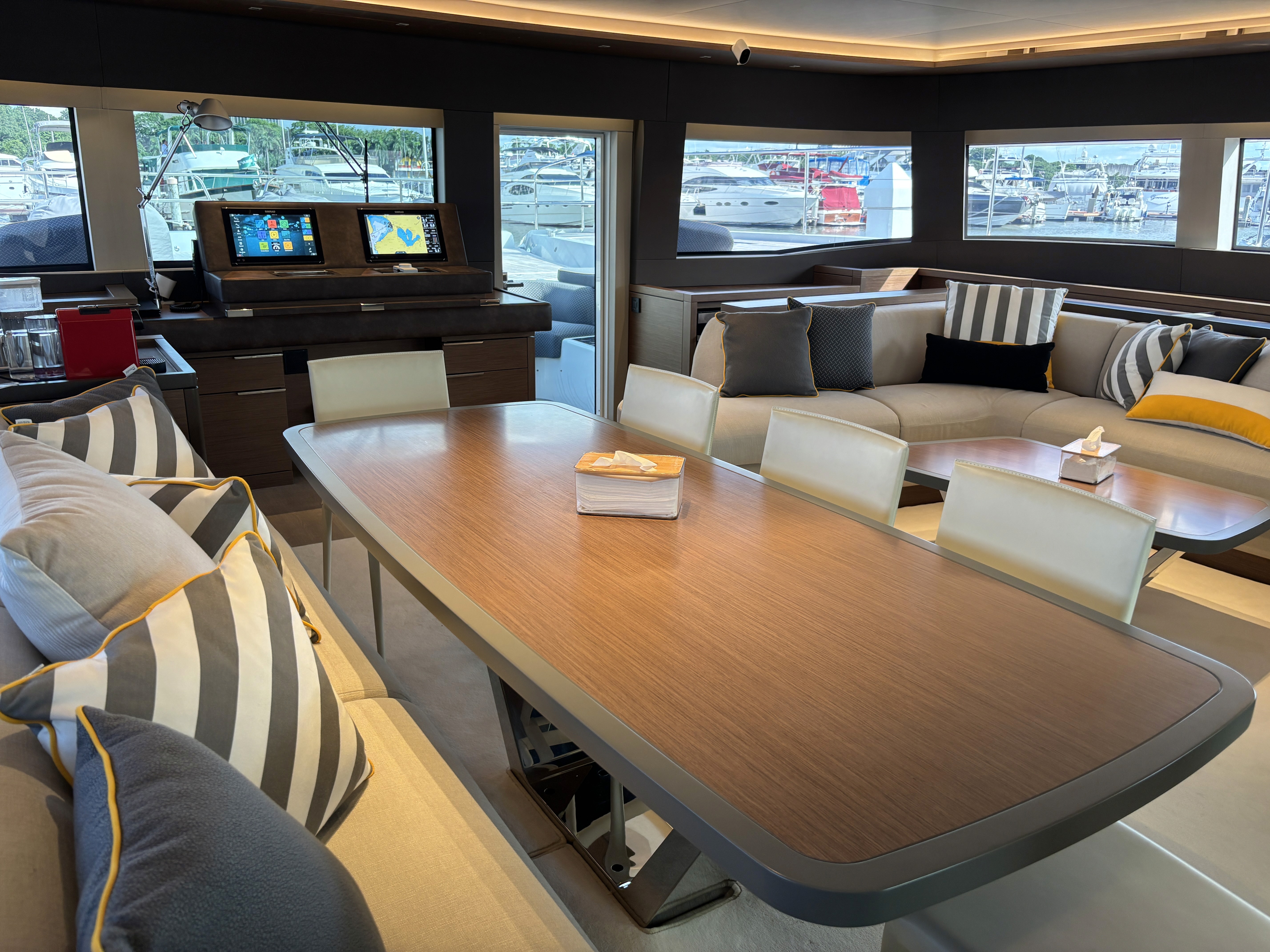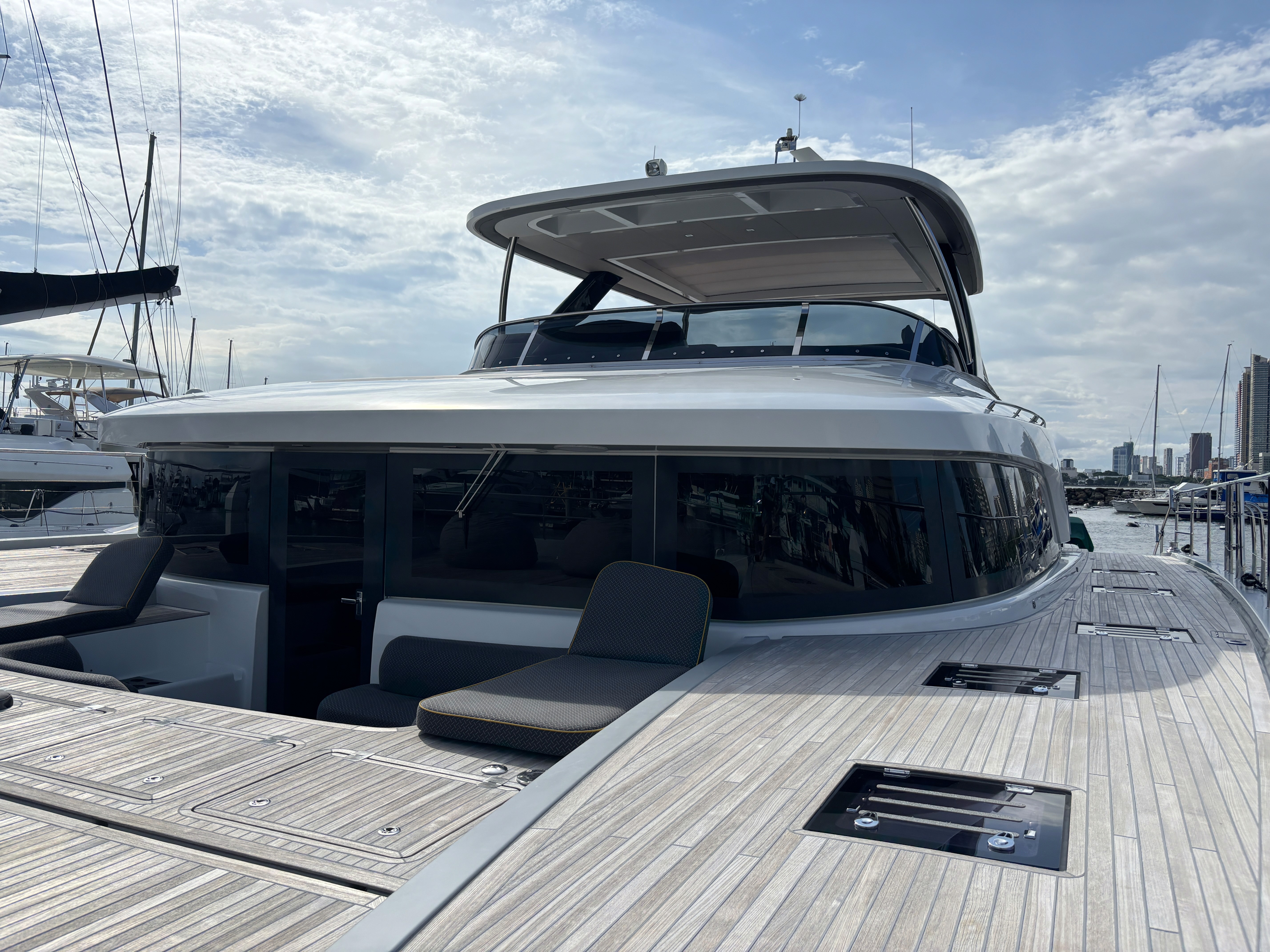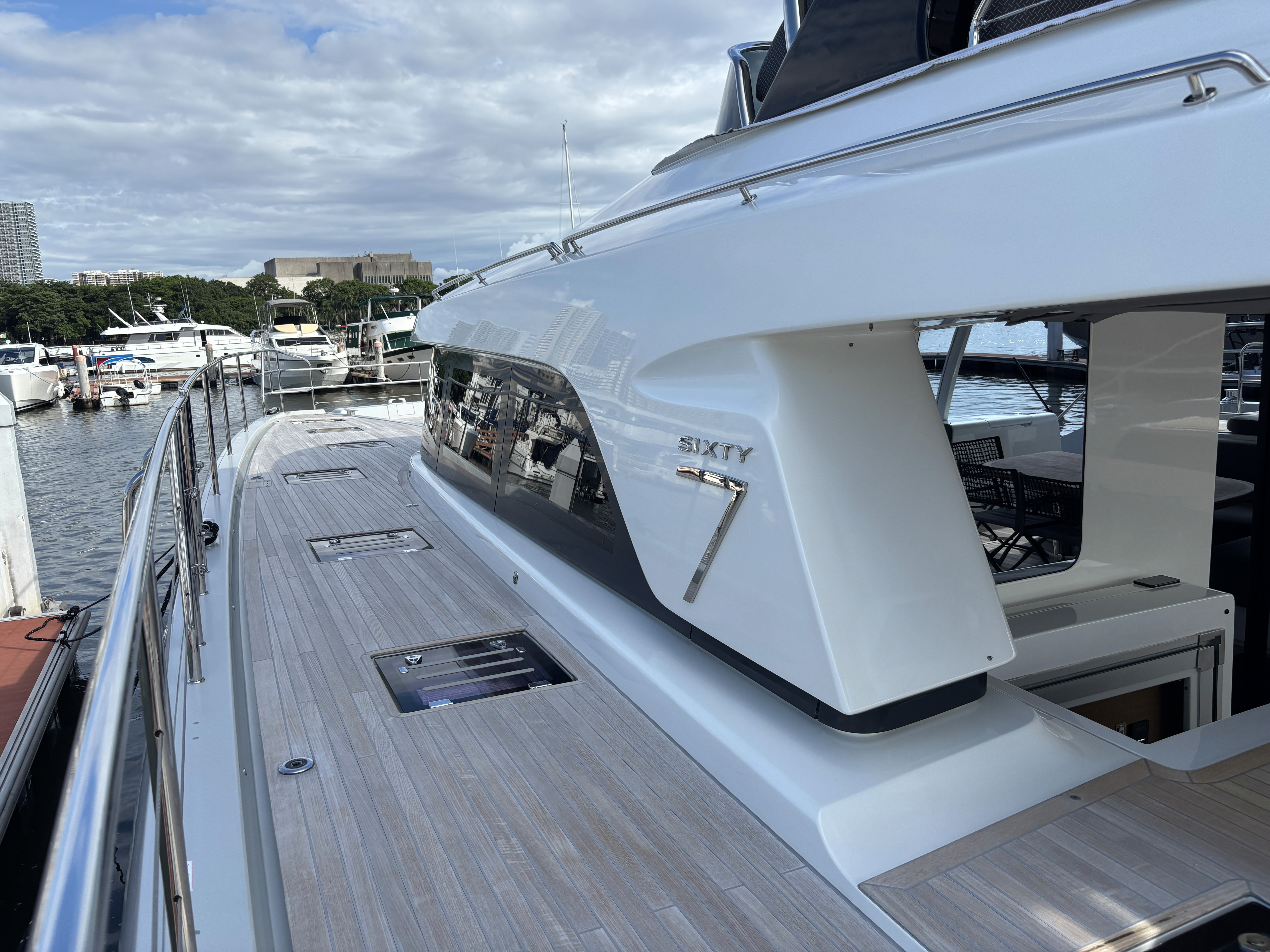 Inside, the SIXTY 7 reveals a sanctuary of light and space. The salon’s panoramic windows flood the contemporary interior with natural light, while the open layout connects seamlessly to the aft cockpit for a true indoor-outdoor living experience. Premium materials, refined finishes, and meticulous craftsmanship create an atmosphere of understated luxury — every detail curated for comfort, serenity, and connection at sea.