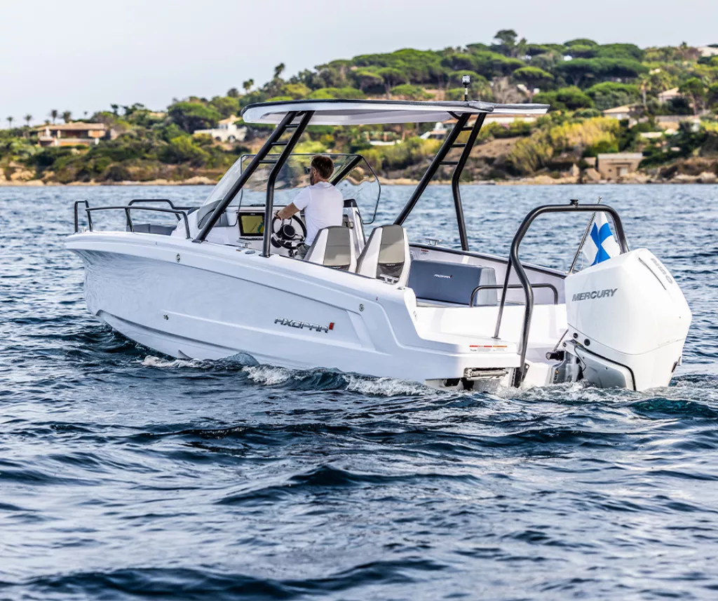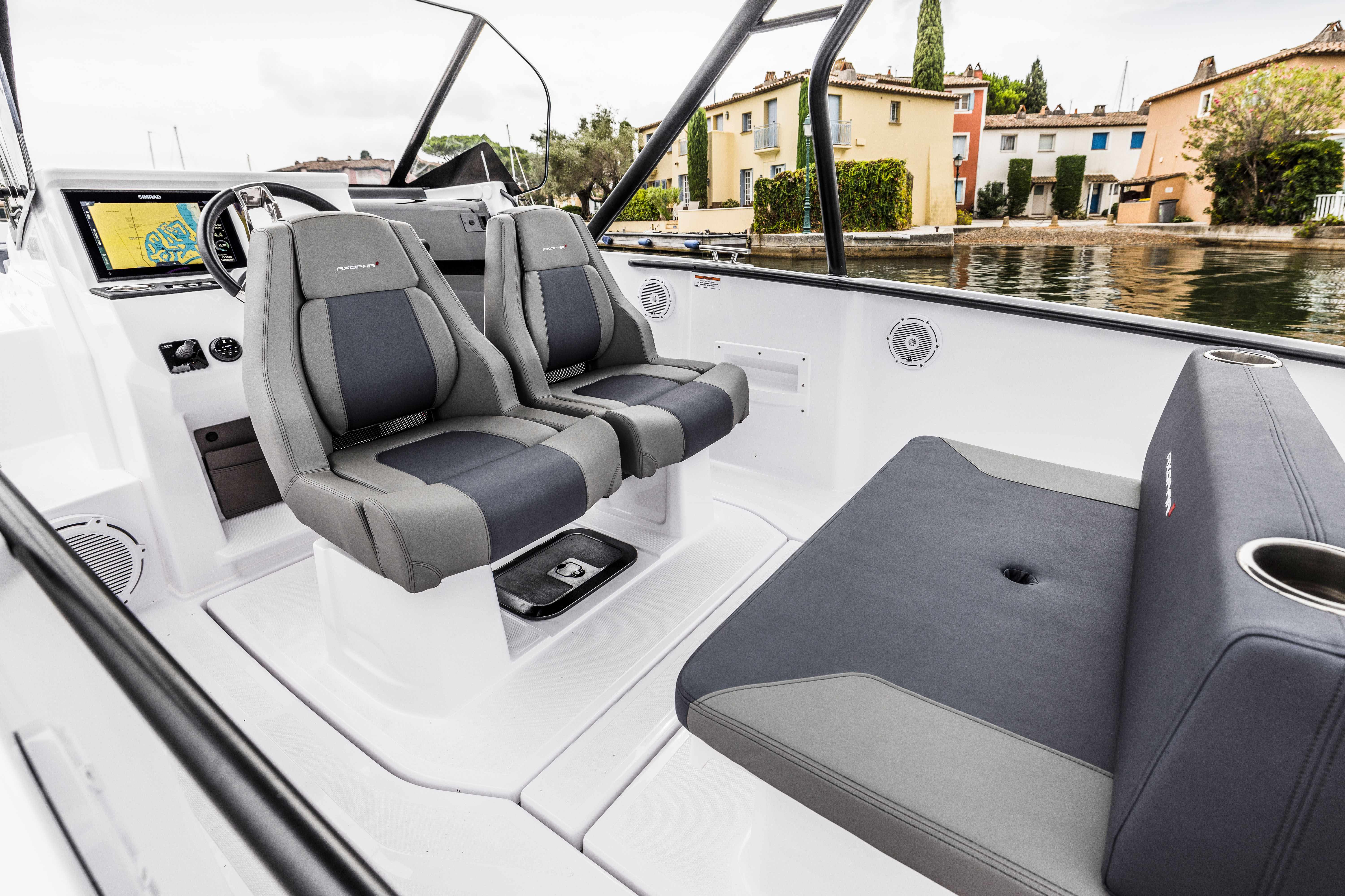The characteristic Axopar 25 is a true crossover between comfortable day boating and extended island-hopping, where the seaworthiness and handling come to the fore. With its raised ‘cuddy cabin’ sleeping accommodation defining the character of the boat, this dynamic and sporty cruiser is now offering more space, more overall comfort and more all-round capability.